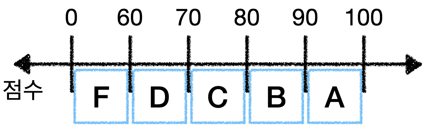 | 클래스 기준 | 점수 < 0 | 0<= 점수 <60 | 60<= 점수 <70 | 70<= 점수 <80 | 80<= 점수 <90 | 90<= 점수 <=100 | 100< 점수 |